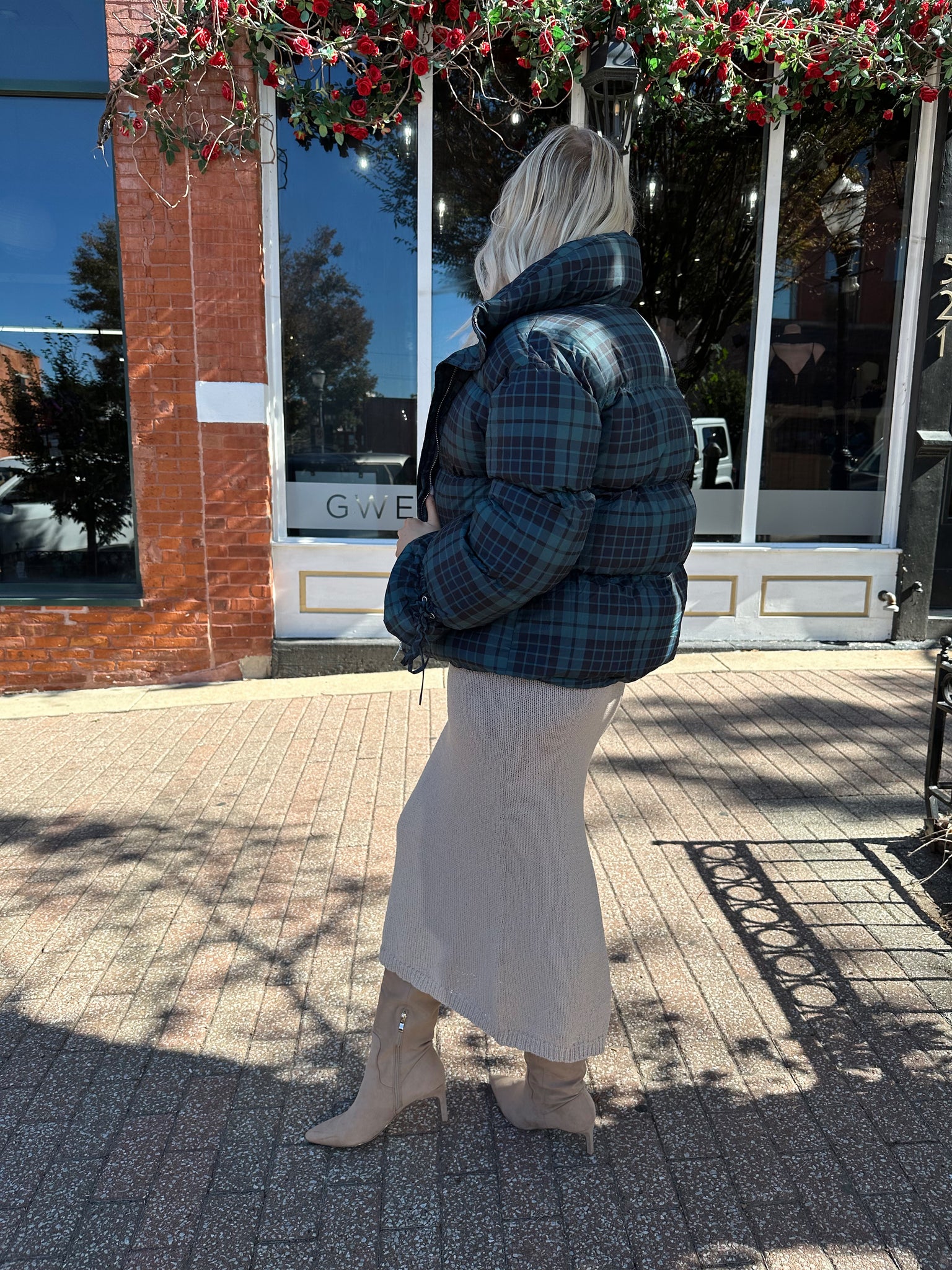 Outerwear just got a bold new upgrade. The Veronica Navy Plaid Puffer Coat combines statement style with everyday comfort, making it your go-to layer for everything from chilly morning commutes to weekend coffee runs. The oversized silhouette delivers effortless volume, while the navy and green plaid print adds a striking, modern edge. Feminine tie details at the waist and cuffs give it a customizable fit, letting you cinch it in or wear it loose depending on your mood.