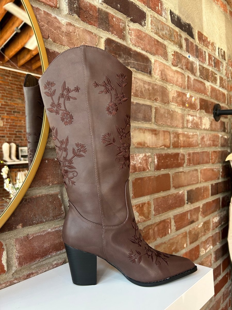 Turn heads with the Miley Dark Brown Embroidered Western Boot, a striking cowgirl-inspired style that blends rugged charm with feminine detail. Crafted in rich dark brown with tonal floral embroidery, this boot adds a touch of artistry to a timeless Western silhouette. The pointed toe and mid-height block heel create a flattering, comfortable fit, making Miley as versatile as it is stylish.