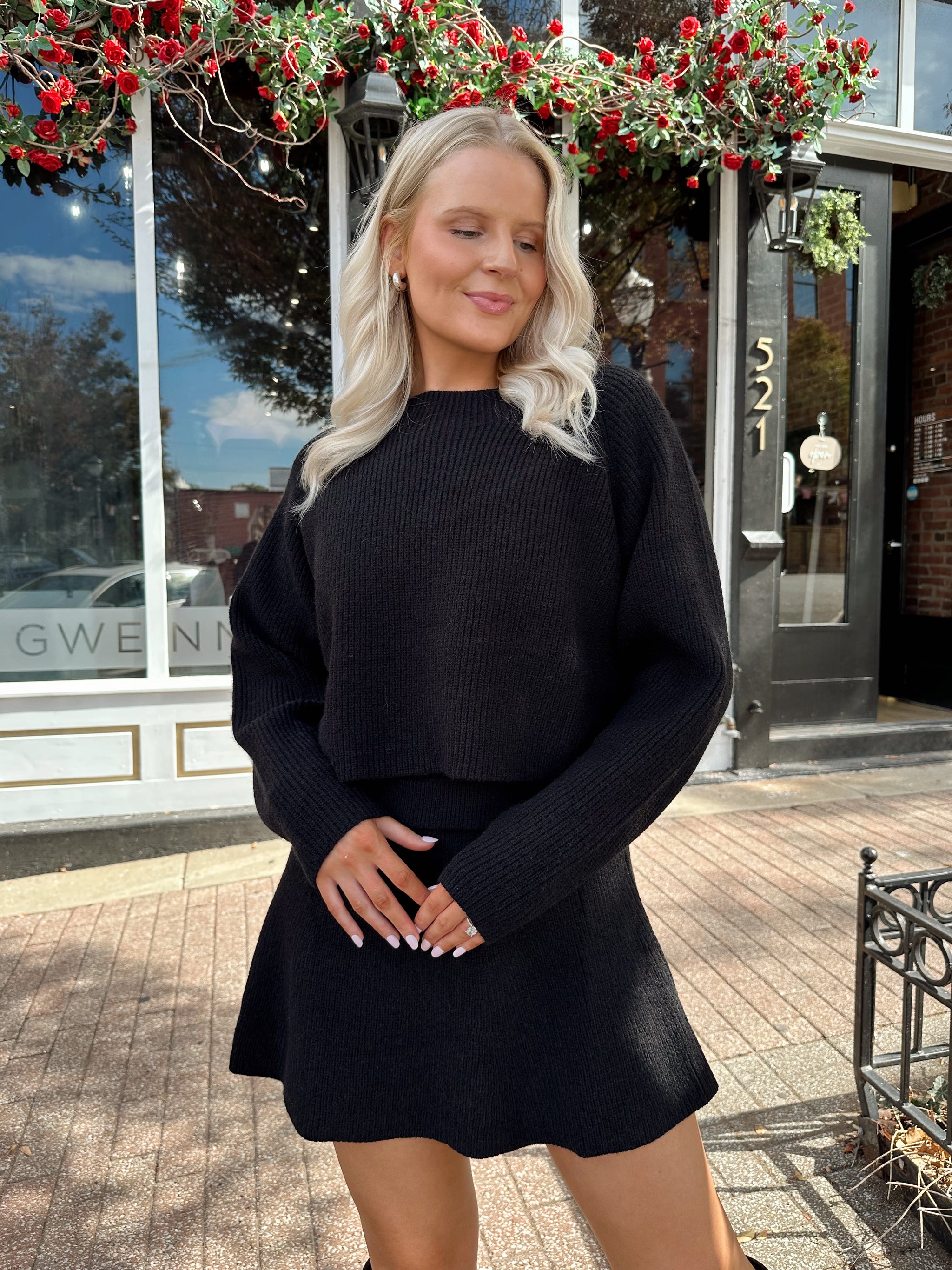Greer Black Long Sleeve Knit Top and Mini Skirt Set