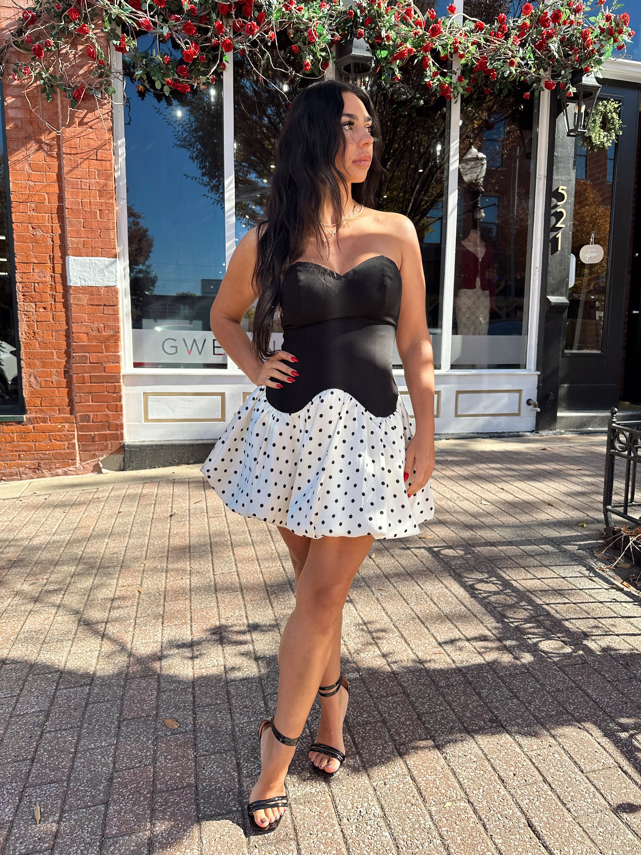 Kala Black and White Polka Dot Bubble Hem Mini Dress